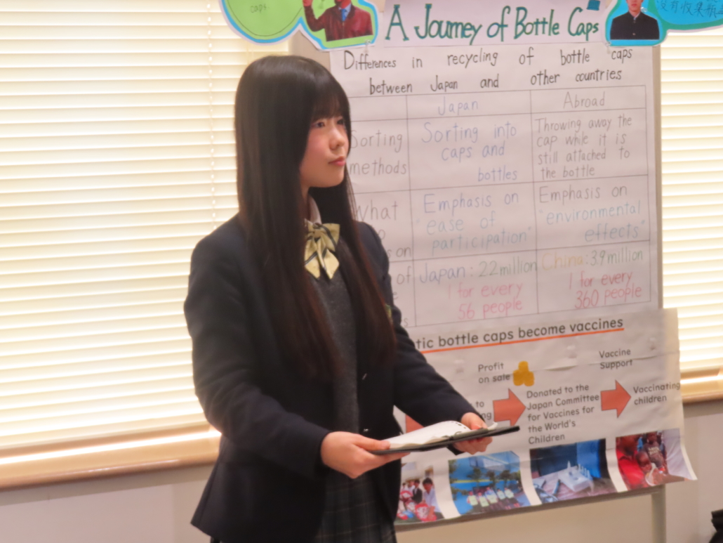 本校生徒は、現在校内で実施しているエコキャップ運動をテーマに準備を進めました。運動の概要に加え、回収されたキャップがリサイクルされるまでの過程についても、キャップ回収業者である「いその株式会社」様のご協力を得て学び、その内容をポスターにまとめました。