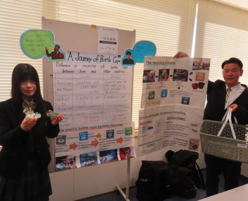 本校生徒は、現在校内で実施しているエコキャップ運動をテーマに準備を進めました。運動の概要に加え、回収されたキャップがリサイクルされるまでの過程についても、キャップ回収業者である「いその株式会社」様のご協力を得て学び、その内容をポスターにまとめました。